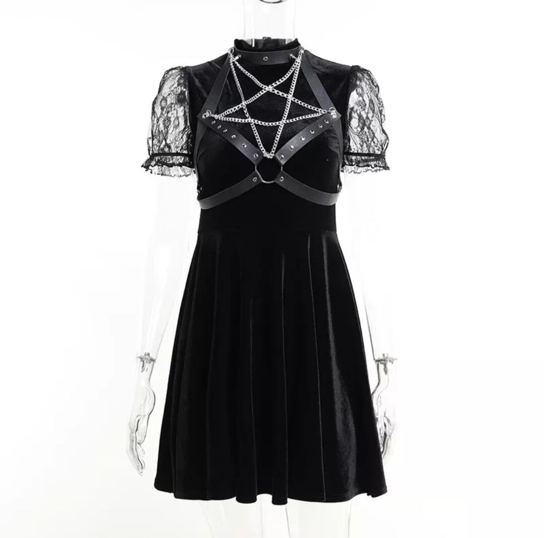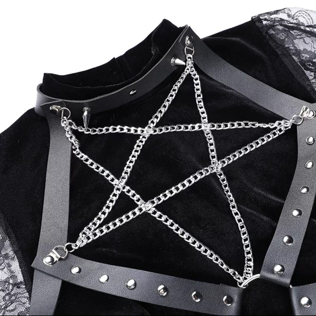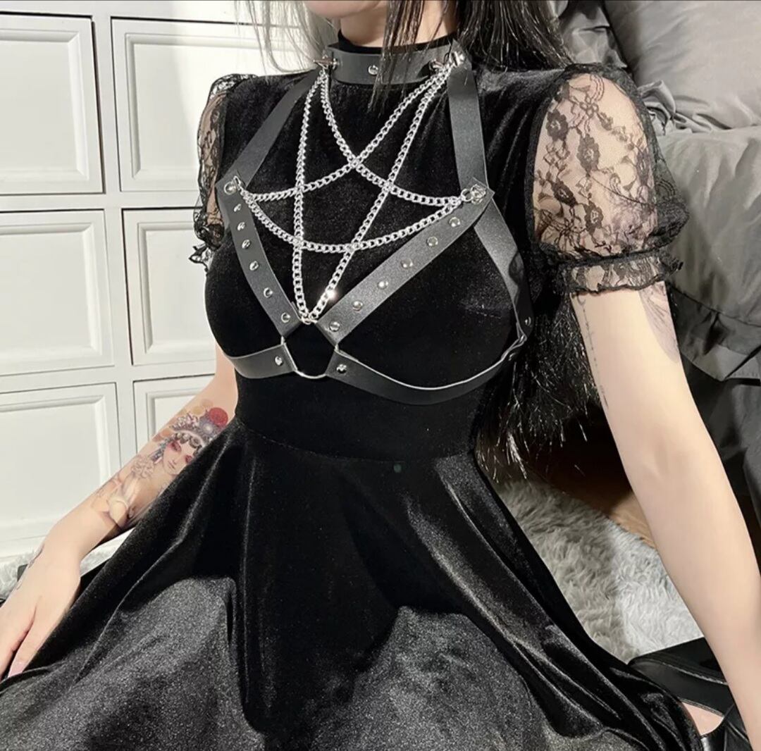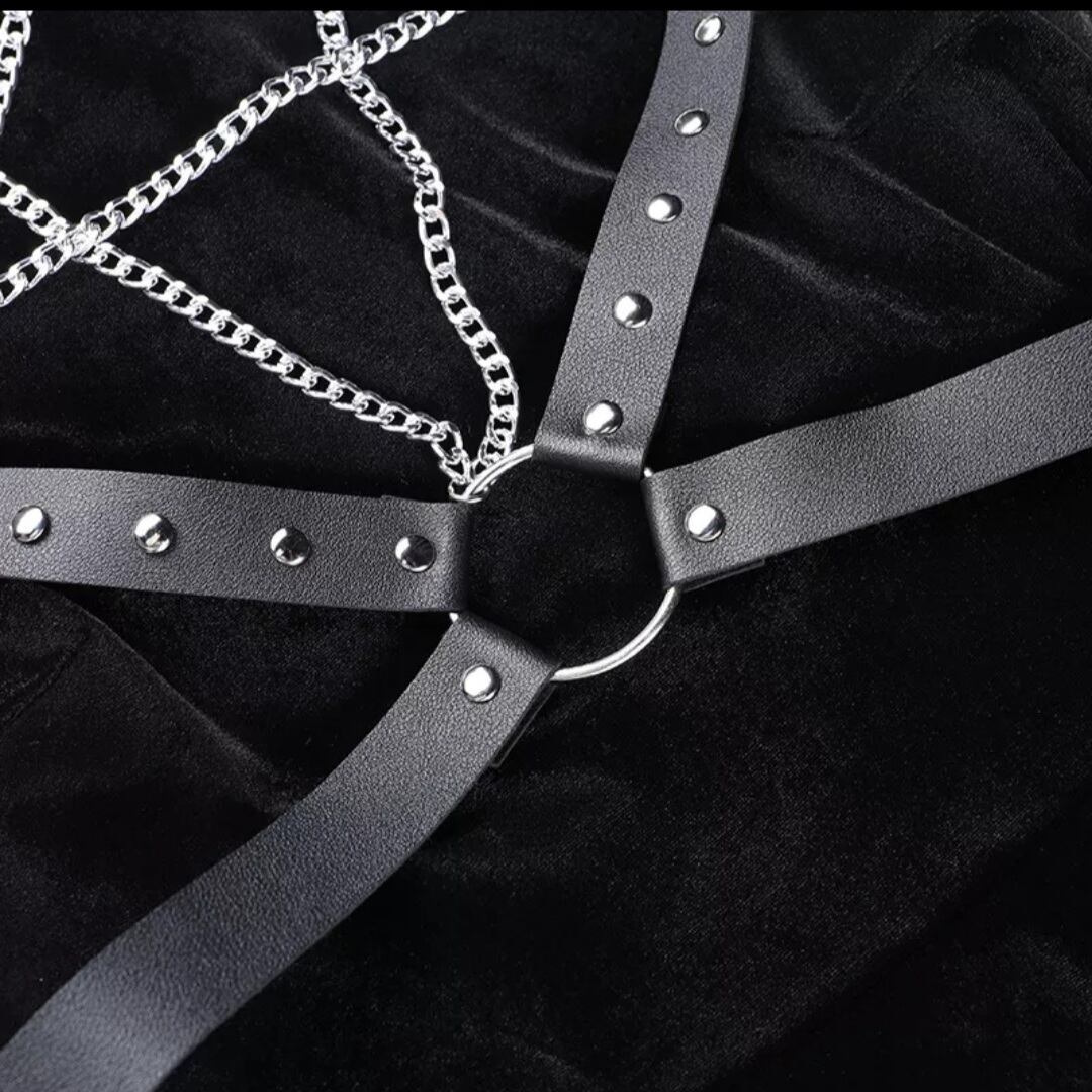 GOTH DARK / PU LEATHER PENTAGRAM STRAP DRESS / GOTHIC ARMS