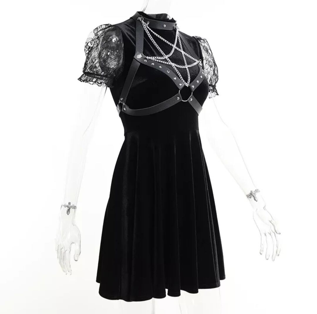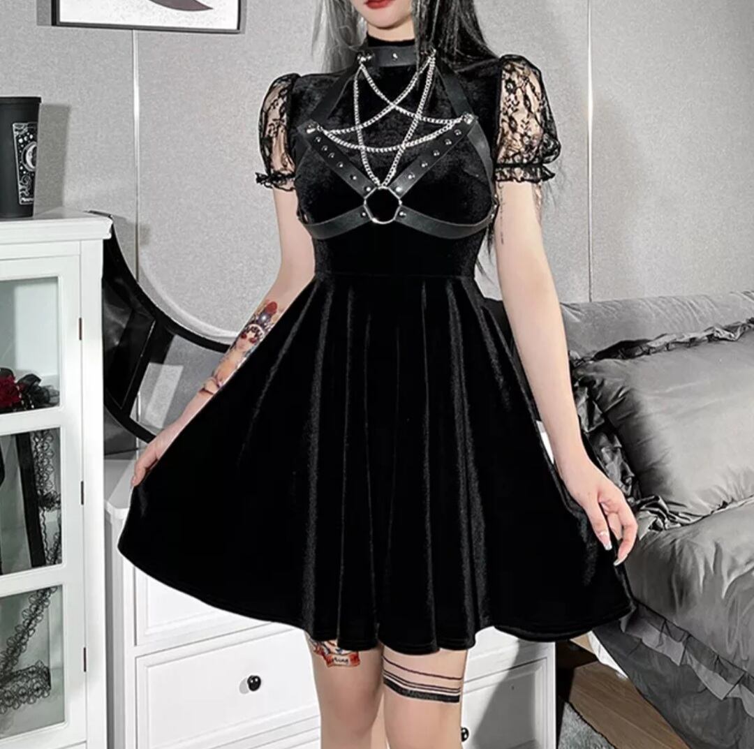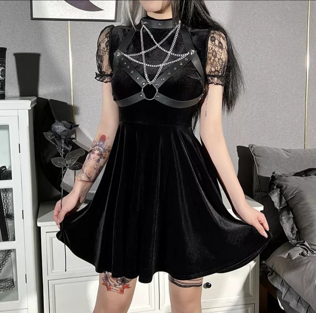 GOTH DARK / PU LEATHER PENTAGRAM STRAP DRESS / GOTHIC ARMS